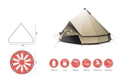 Das Grand Canyon INDIANA 10 ist ein klassisches Rundzelt mit einer senkrechten Mittelstange und einem vormontierten A-Rahmen zur Stützung des großen Zelteingangs. Es bietet Platz zum Schlafen für bis zu 10 Personen oder ausreichend Platz als Treffpunkt am Tag für größere Gruppen. Die eingenähte Bodenwanne schützt vor Insekten und garantiert ein einfaches Aufbauen des Zeltes. Die großen Belüftungsöffnungen mit Abdeckung und die Moskitonetze auf der Außenplane sorgen für eine hervorragende Luftzirkulation und ein stets angenehmes Raumklima im Innenzelt.