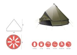 Das Grand Canyon Indiana 8 Zelt ist ein klassisches Rundzelt mit einer senkrechten Mittelstange und einem vormontierten A-Rahmen zur Stützung des großen Zelteingangs. Es bietet Platz zum Schlafen für bis zu 8 Personen oder ausreichend Platz als Treffpunkt am Tag für größere Gruppen. Die eingenähte Bodenwanne schützt vor Insekten und garantiert ein einfaches Aufbauen des Zeltes. Die großen Belüftungsöffnungen mit Abdeckung und die Moskitonetze auf der Außenplane sorgen für eine hervorragende Luftzirkulation und ein stets angenehmes Raumklima im Innenzelt.