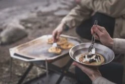 Die Pfanne hat eine leichte Vertiefung in der Mitte – perfekt zum Frittieren oder Braten. Die Innenkanten der Pfanne sind leicht gerundet, wodurch es leichter ist Pfannkuchen, Fleisch etc. zu wenden. An den Seiten ermöglichen zwei Griffe die optimale Positionierung der Pfanne über dem Feuer. Die Beine werden in spezielle Ösen geschraubt, die sich nicht mit Fett oder Ruß zusetzen. Die Beine selber bestehen ebenfalls aus Edelstahl und haben ein spezielles Gewinde, das vor Schäden schützt. Der rechteckige Querschnitt der Beine bietet besseren Halt zur Montage und Demontage der Beine.