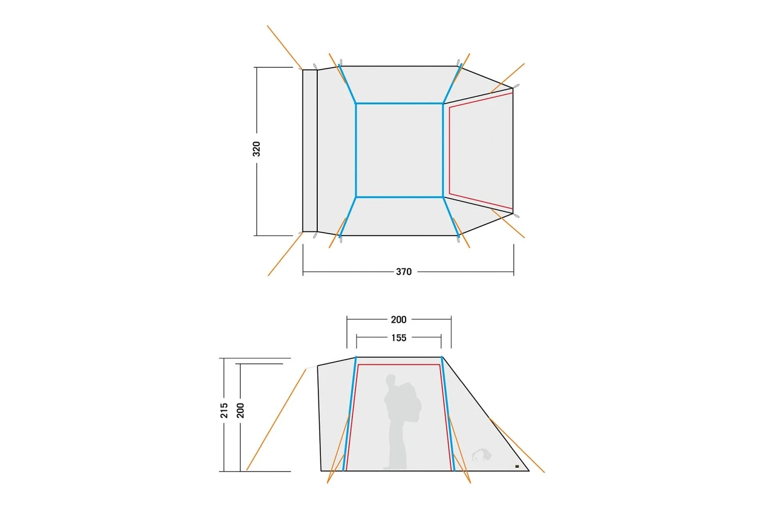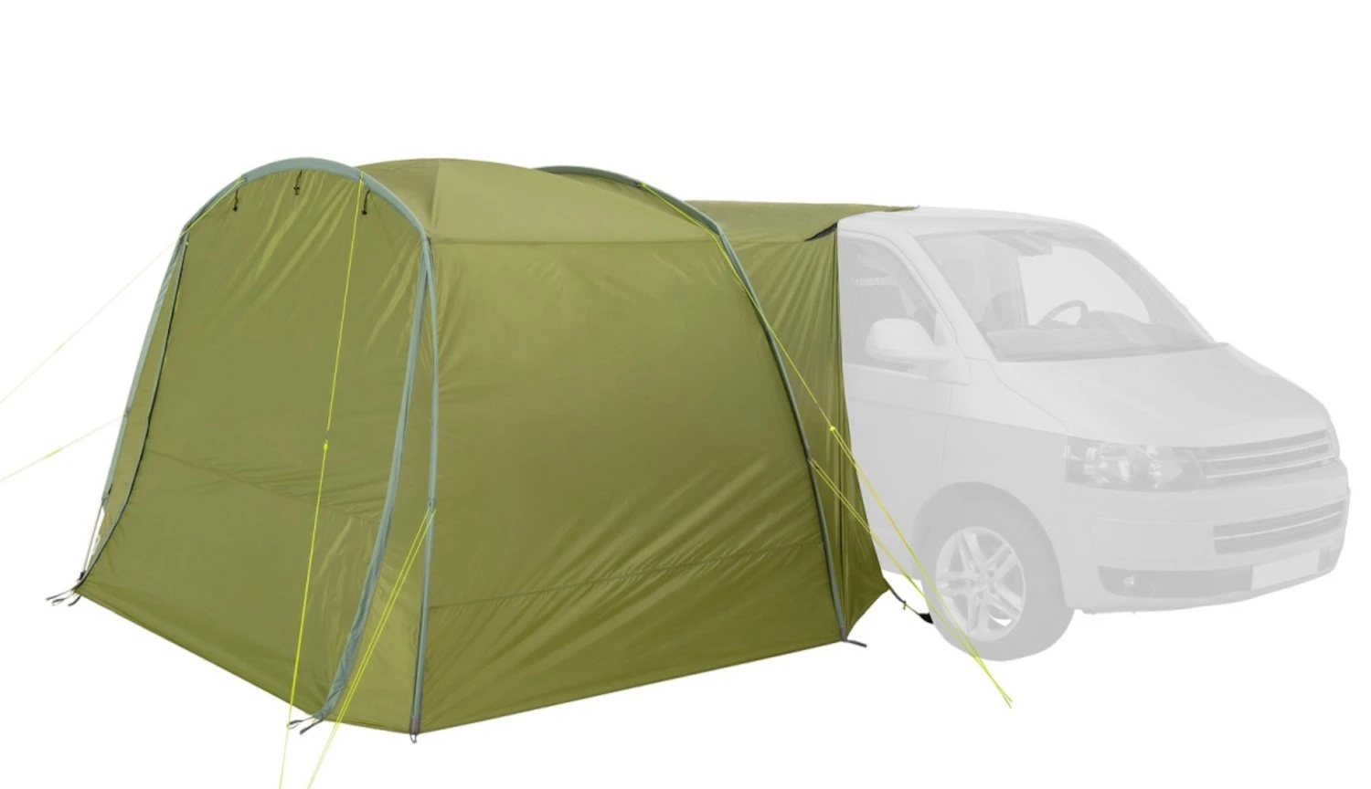 Stehhohes Vorzelt mit Tunnelkonstruktion zum Anbau an Camping-Busse verschiedener Marken. Das Van Camp Basic wird mit zwei Gestängebögen aufgespannt und mit einem Keder-Adapter in die Kederschiene des Busses eingezogen. Die Kederbefestigung lässt sich vom aufgestellten Zelt abzippen, so dass es auch alleine stehen kann. Das Van Camp Basic besitzt einen Frontzugang mit Doppelreißverschluss, der hochgerollt und auch als Sonnendach aufgespannt werden kann. Der Fronteingang lässt sich mit einem separaten Moskitonetz verschließen. Der in der Rückwand befindliche Eingang in den Bus kann ebenfalls per Reißverschluss verschlossen werden.